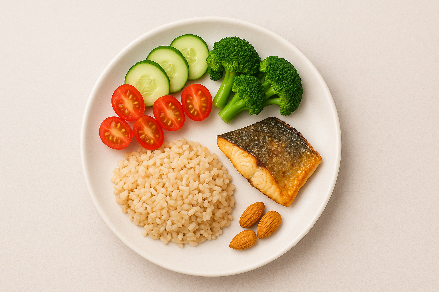 - 아침 식사: 현미밥에 오이와 토마토를 곁들인 샐러드, 삶은 달걀 한 개를 추가하여 단백질 보충.